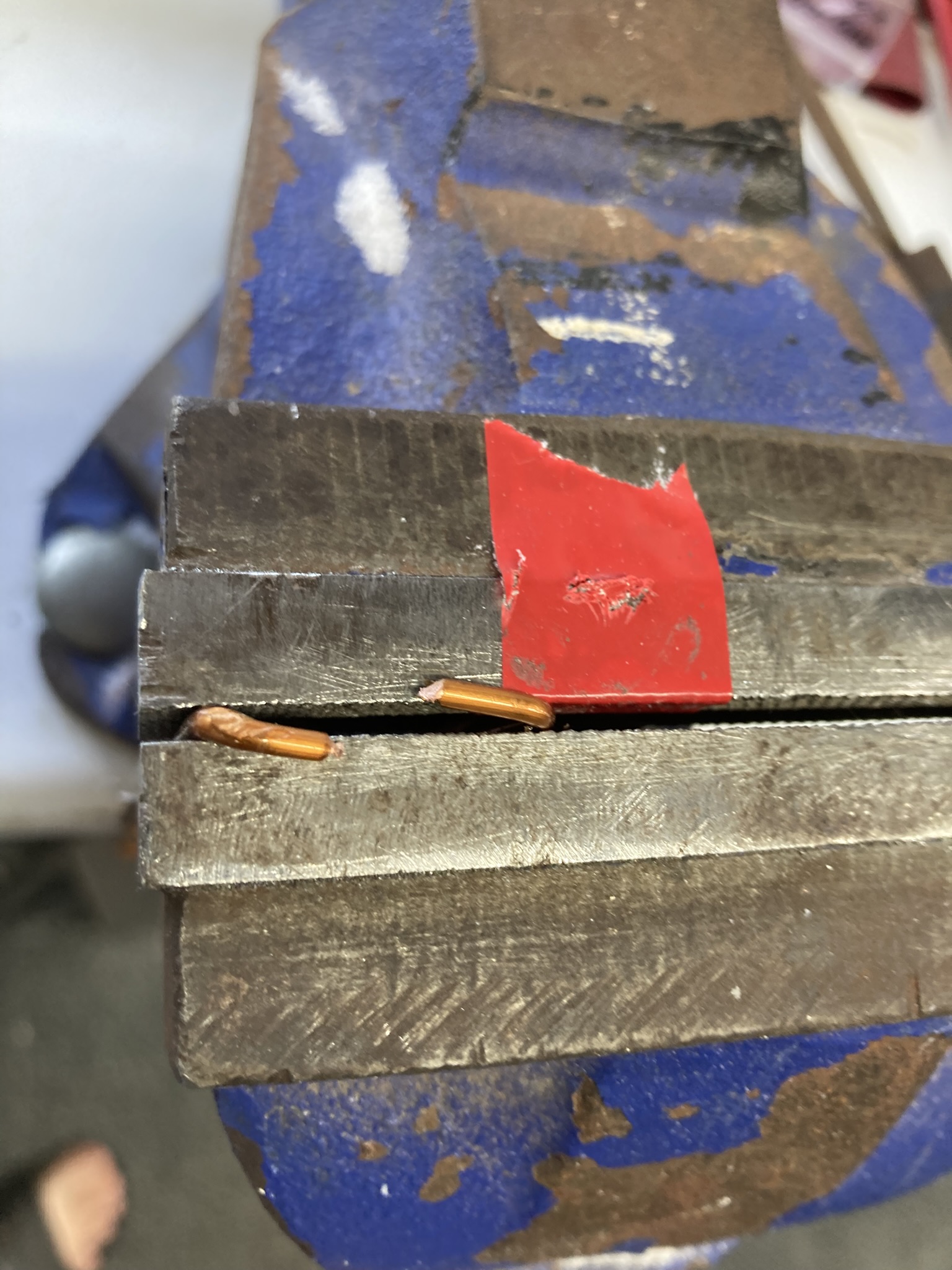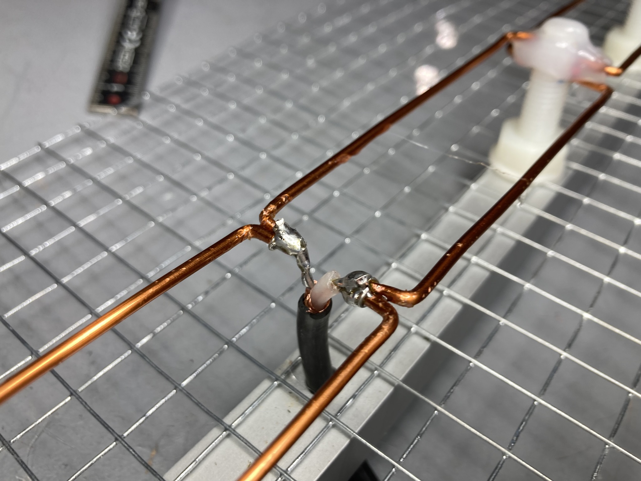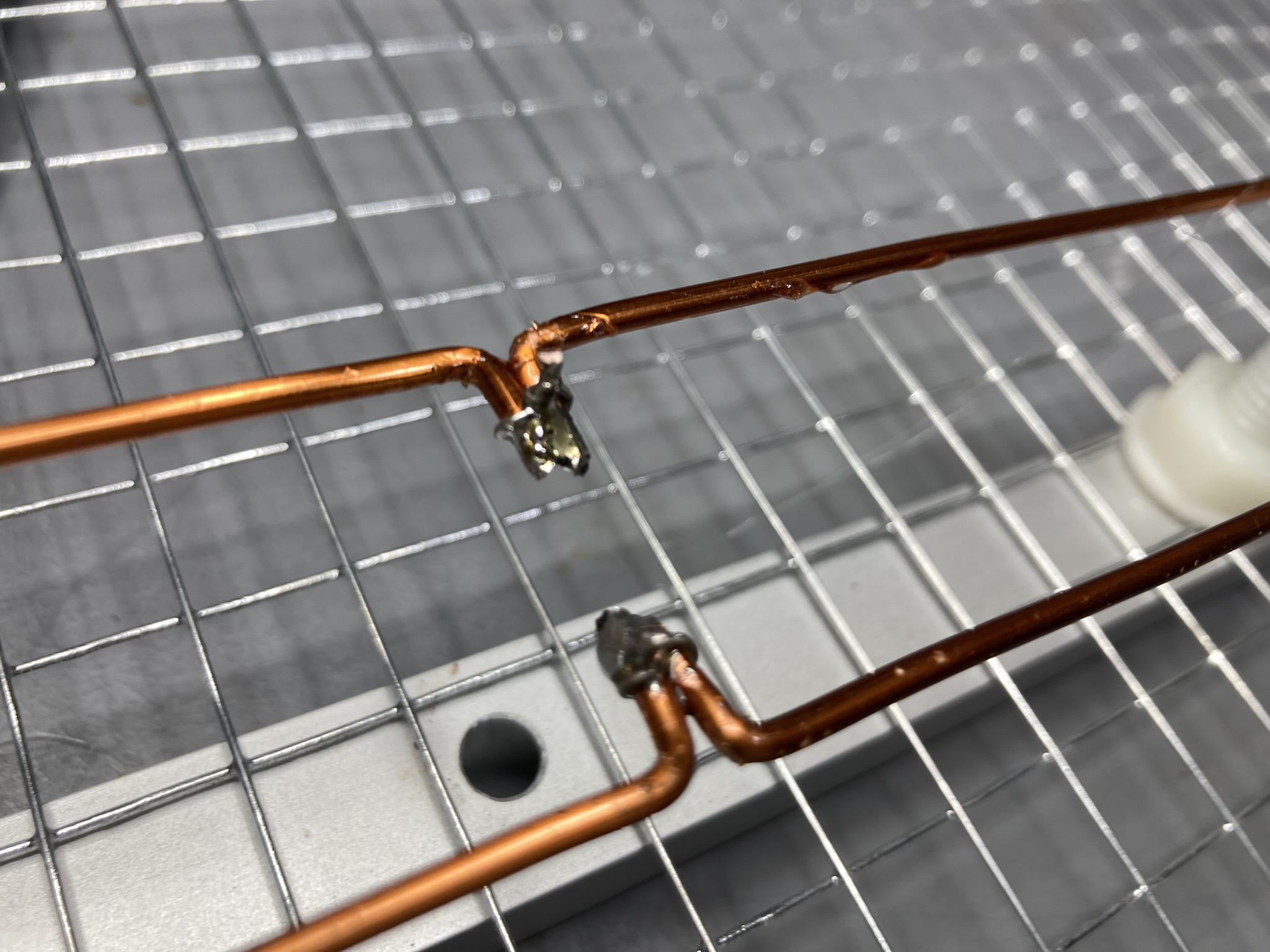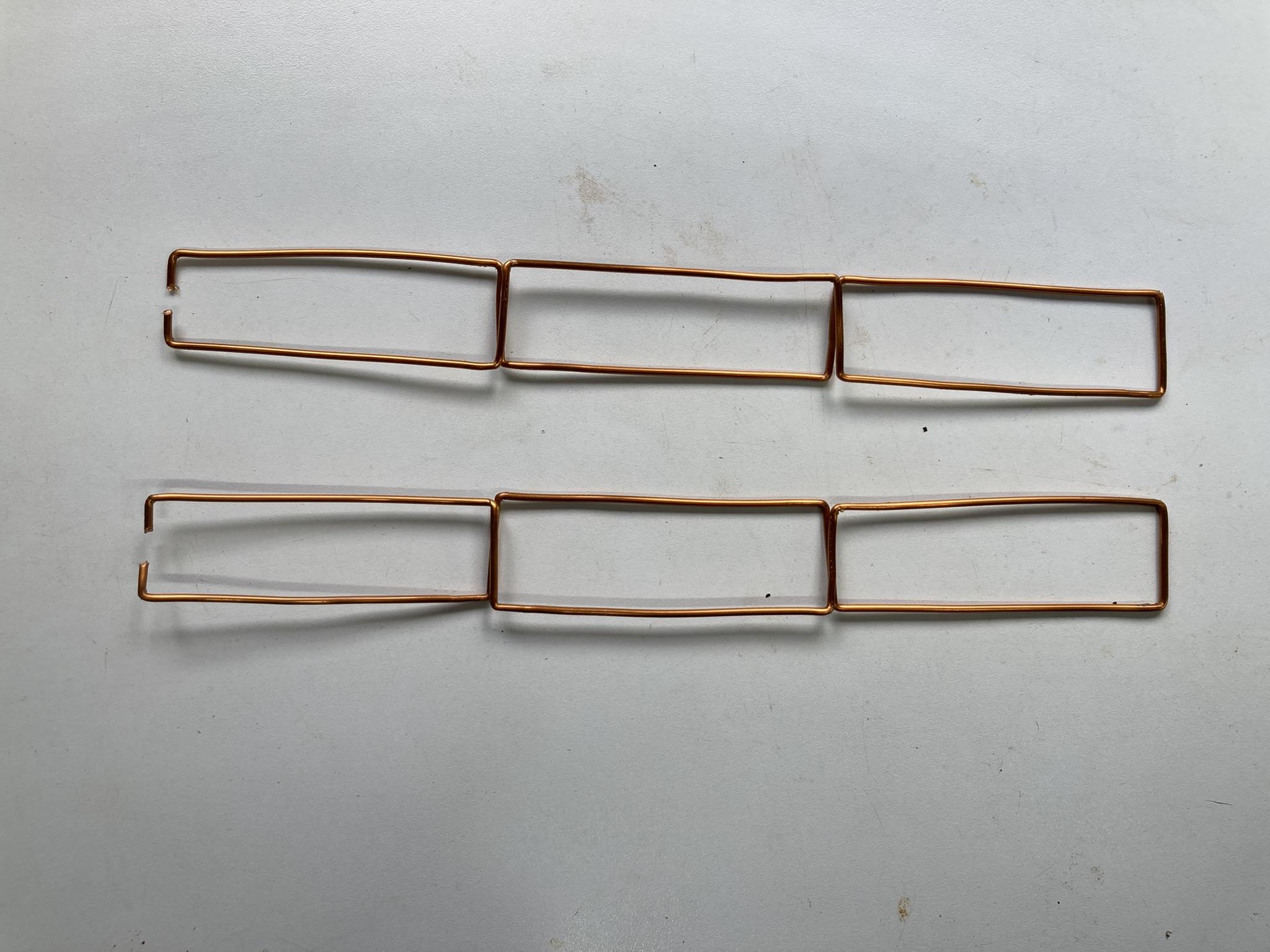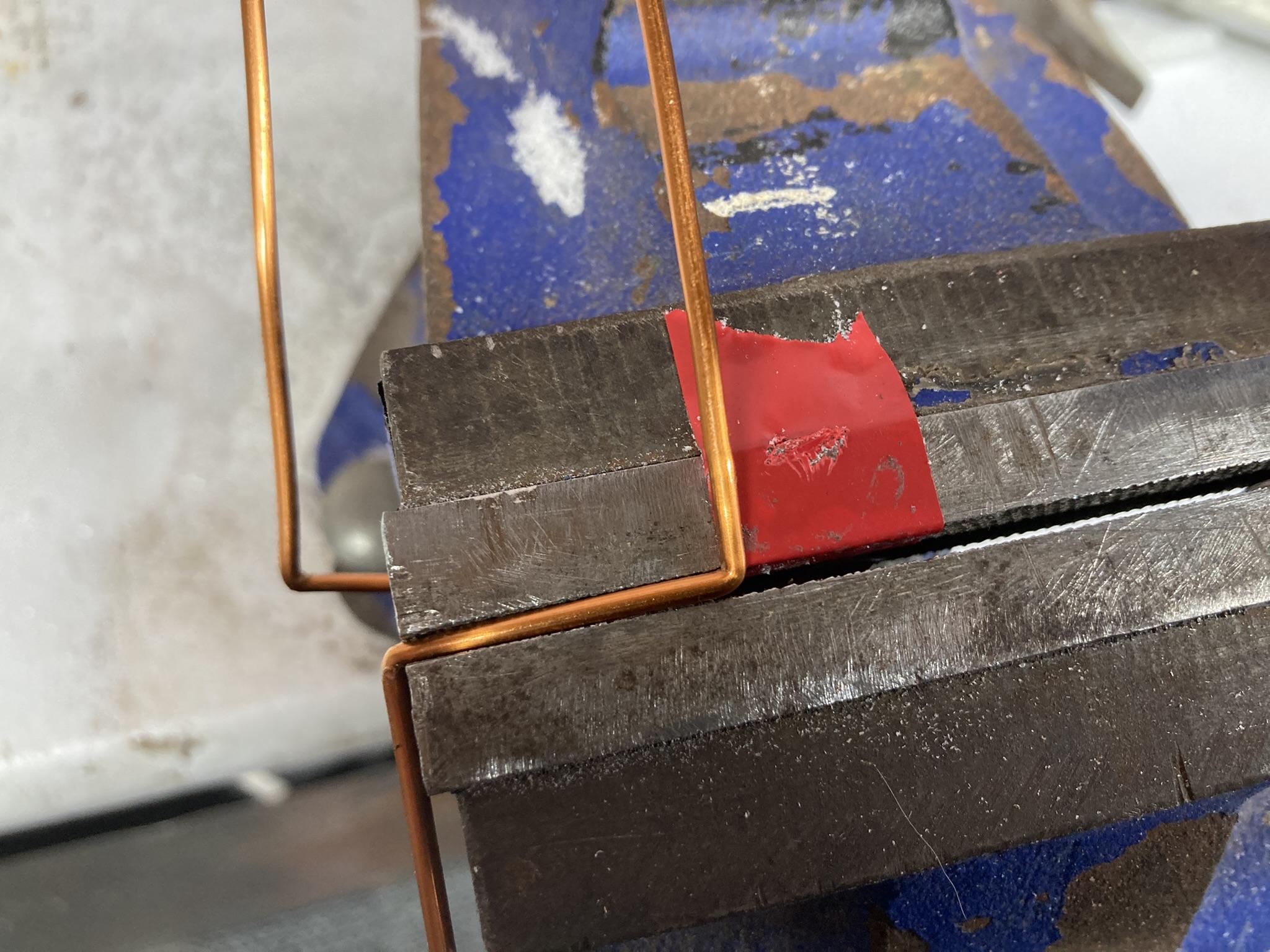 2mm enamelled copper wire bent in vice and hammered at corners.