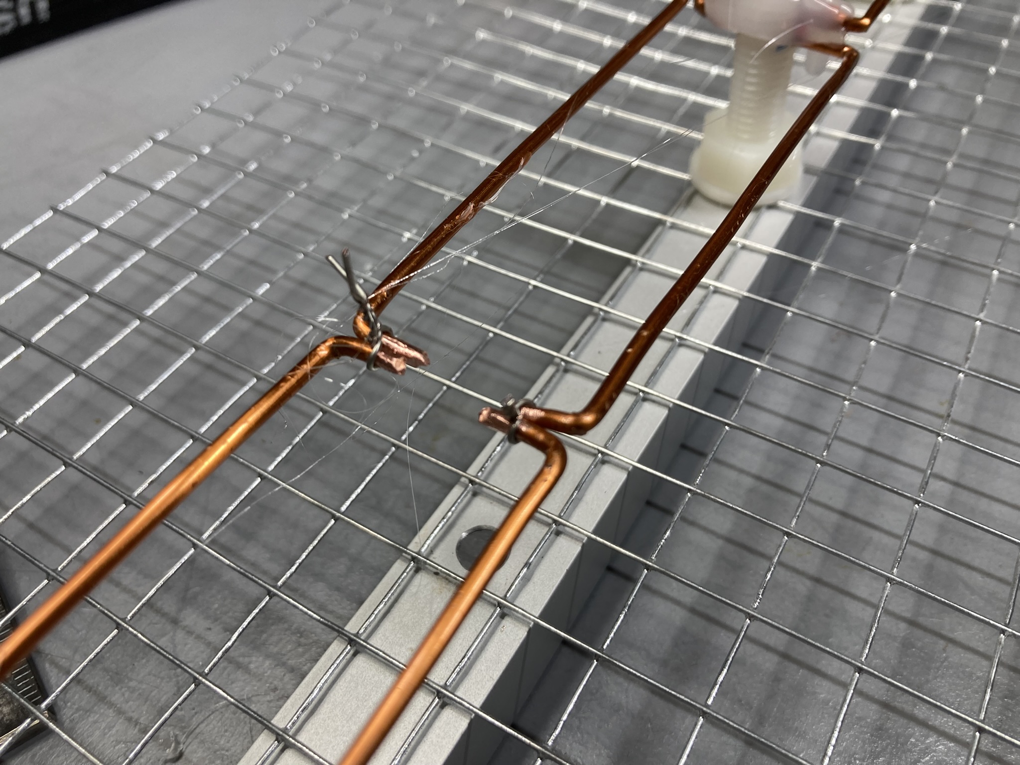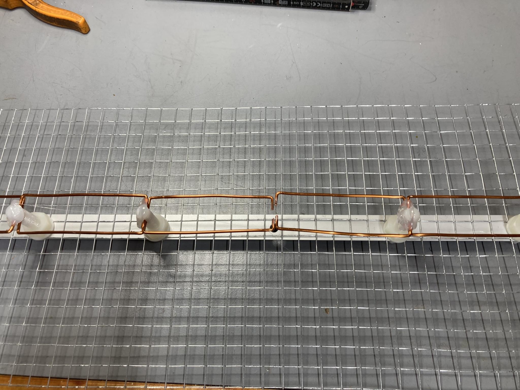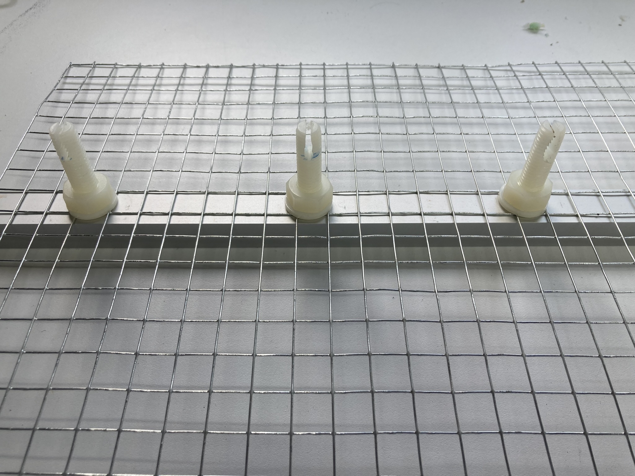 Fit spacers and elements. The end of the elements have spacers to raise the wire to 30mm height from mesh, the cross over elements have spacers between them at 30mm height. Cover all element mounting points in hot glue