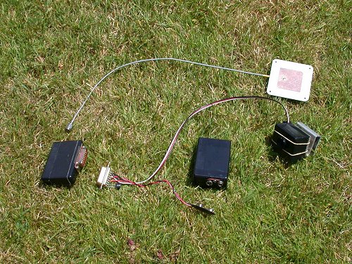 The complete kit of camera, transmitter, power pack and flat plate aerial